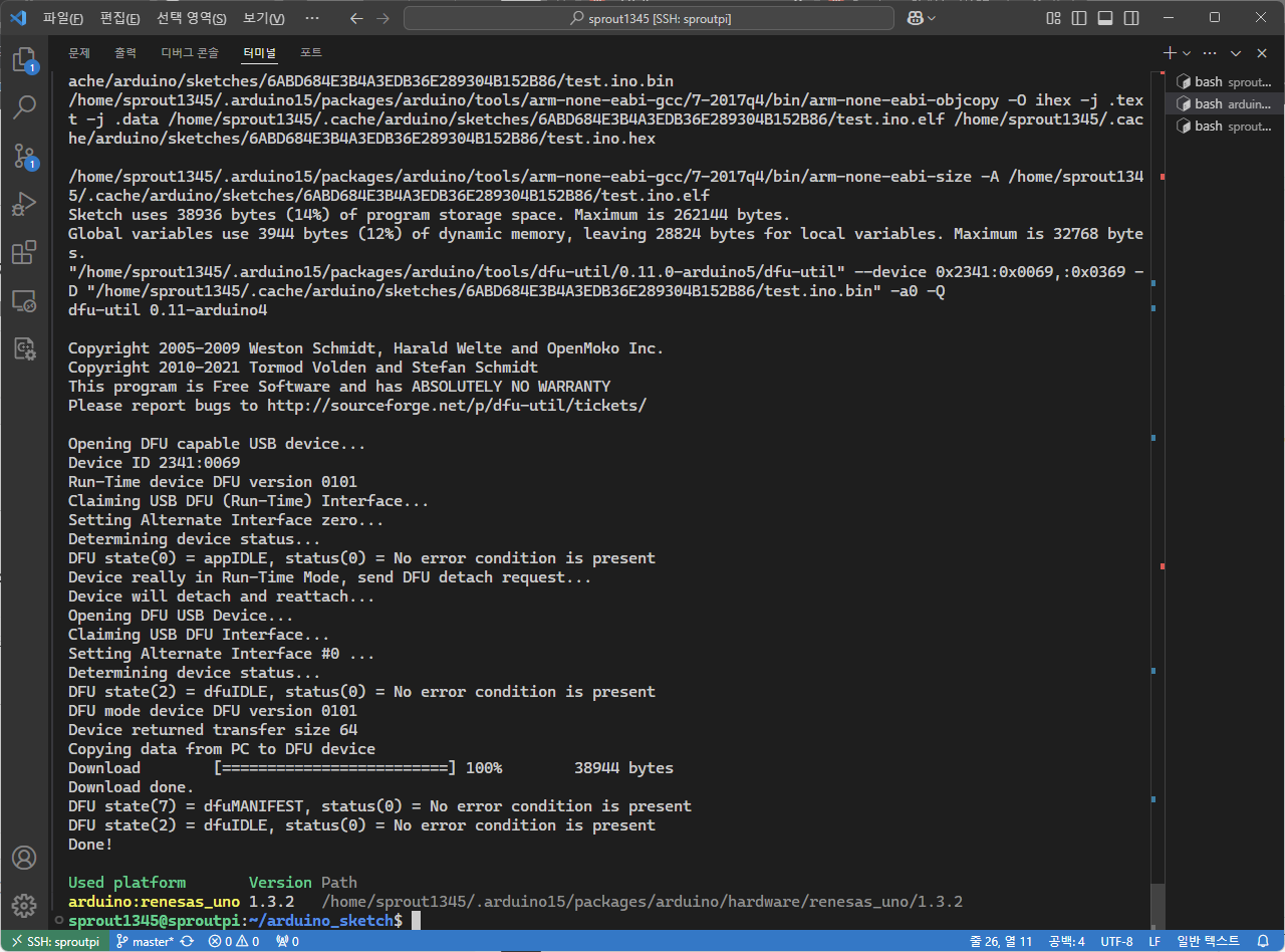 아래는 Windows에서의 컴파일 및 업로드 과정의 일부이다.