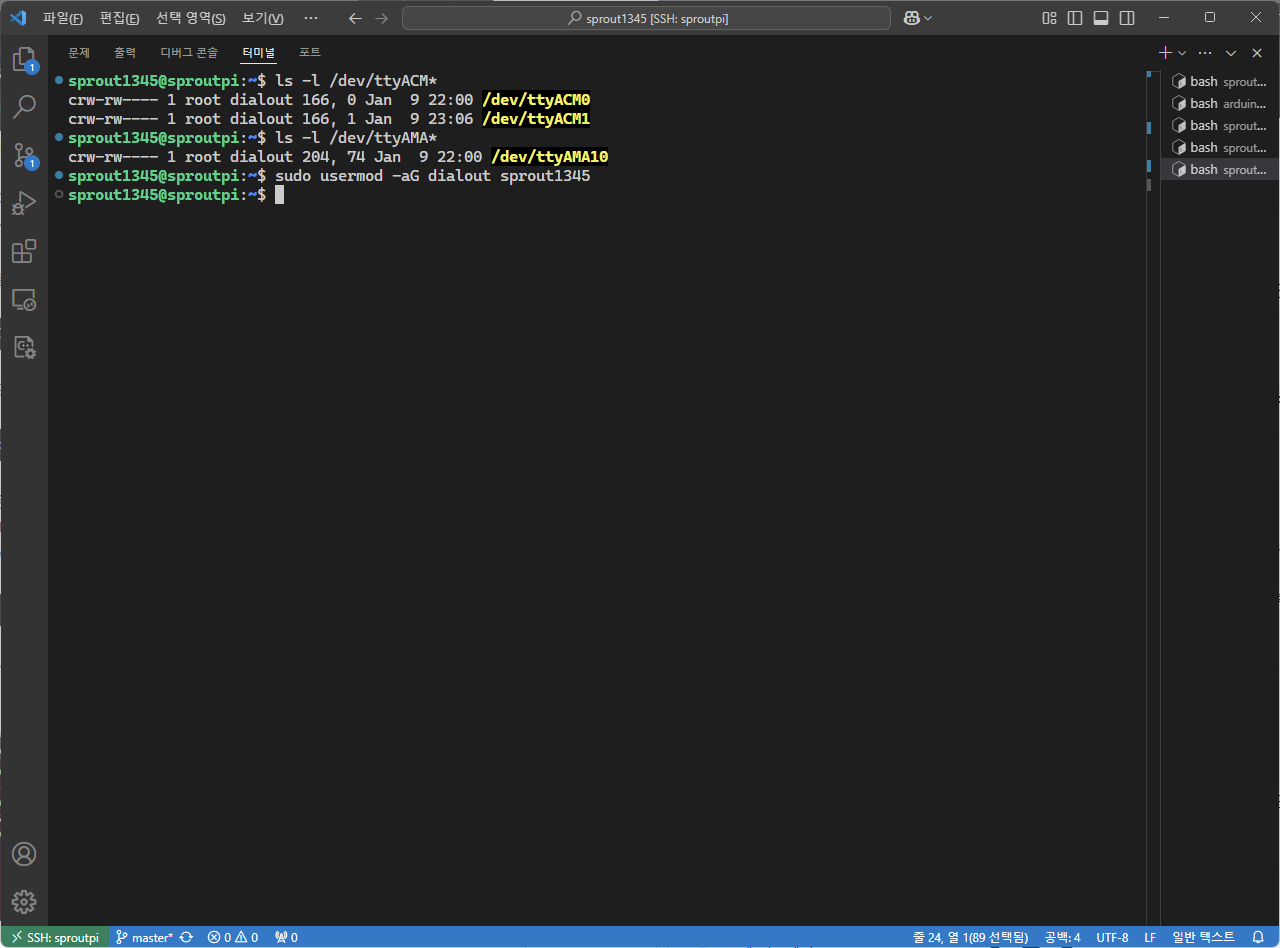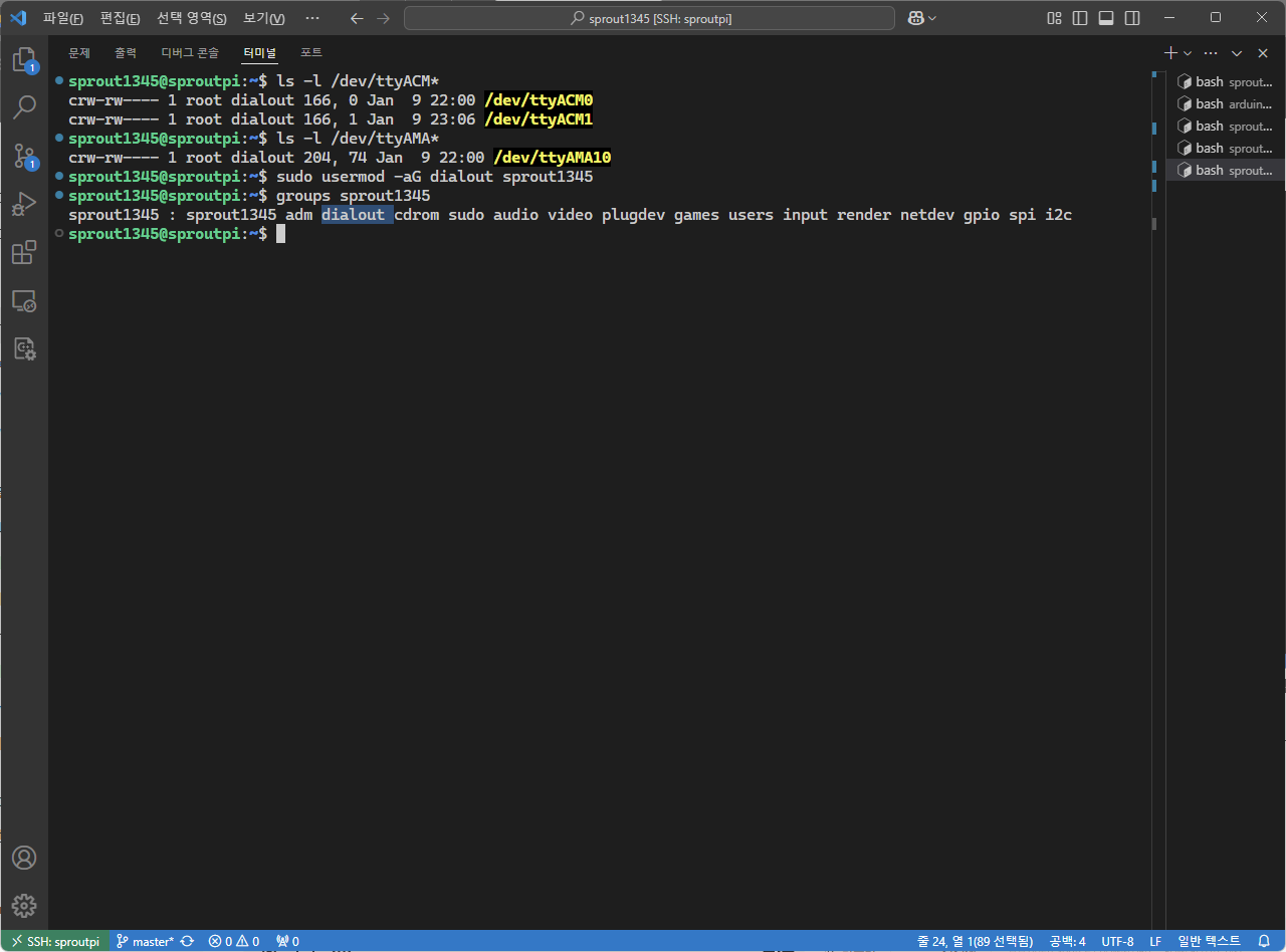 나타난 목록에 "dialout"이 있으므로 사용자가 정상적으로 그룹에 추가되었다.