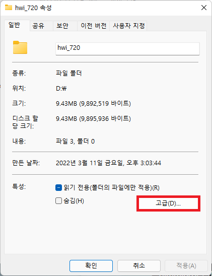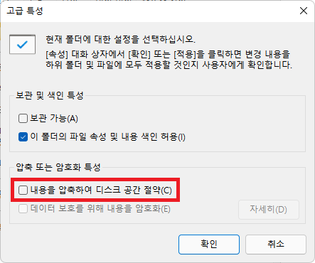 고급 속성 창에서 '내용을 압축하여 디스크 공간 절약'을 선택한 뒤,