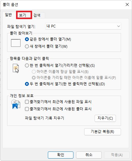 다음과 같이 '폴더 옵션 창이 뜨는데, 여기서 보기 항목으로 들어간다.