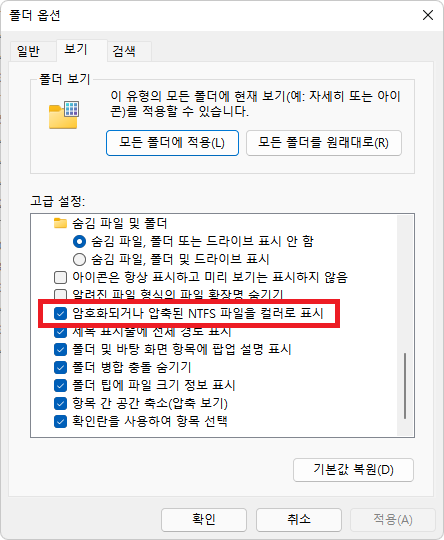 '암호화되거나 압축된 NTFS 파일을 컬러로 표시' 항목을 체크한 후 '적용' 버튼을 누르면 된다.