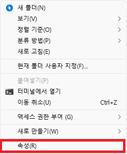 컨텍스트 메뉴에서 '속성'을 선택한다.