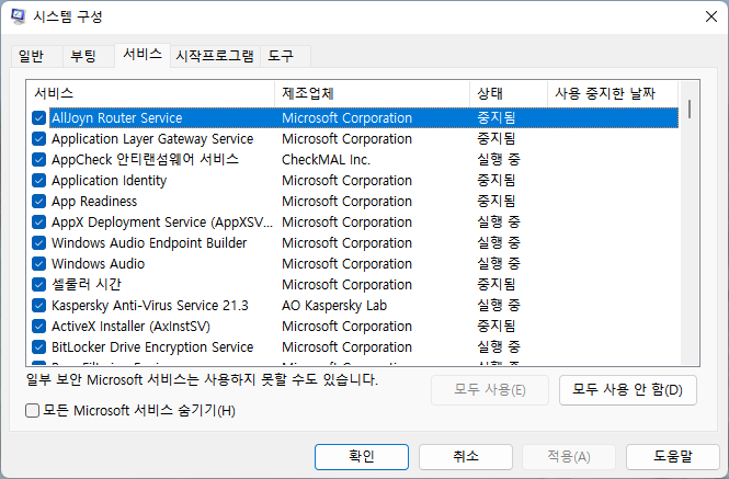 '모두 사용 안 함' 버튼을 눌러 사용자 서비스를 비활성화한다.