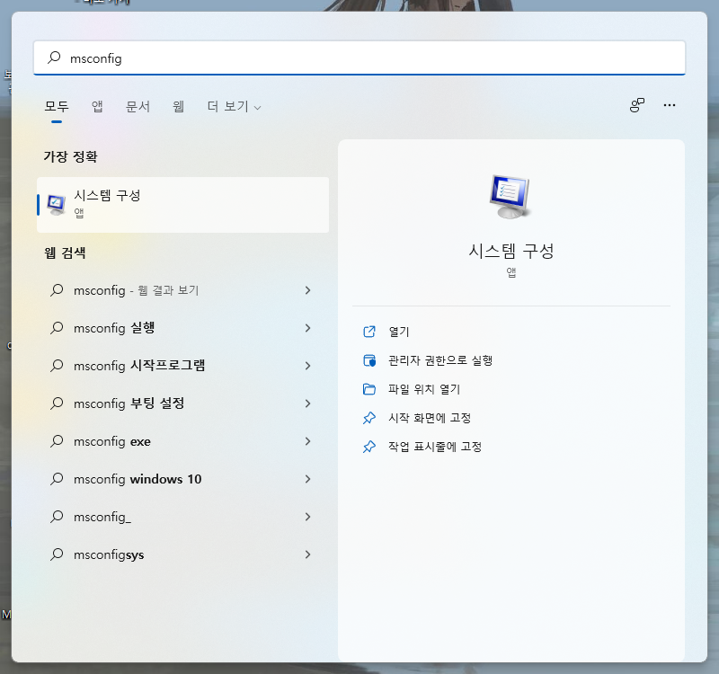 검색 창에 'msconfig'를 입력하여 실행한다.