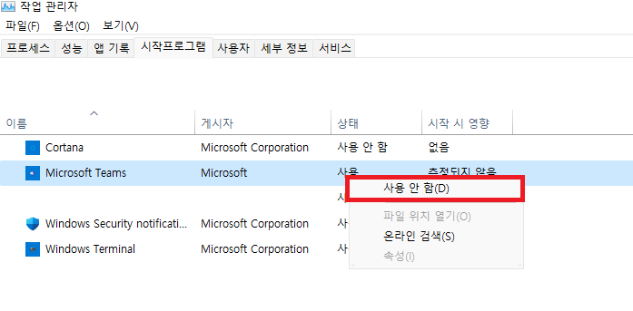 각각의 시작 프로그램을 우클릭한 후, 모두 '사용 안 함'으로 바꾸면 된다.