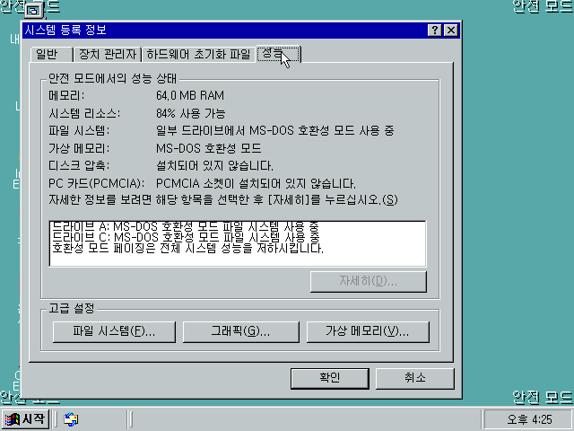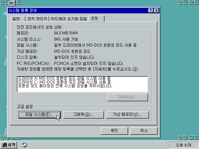 '문제 해결' 탭의 '32비트 보호 모드 디스크 드라이버를 사용하지 않음'을 체크하고,