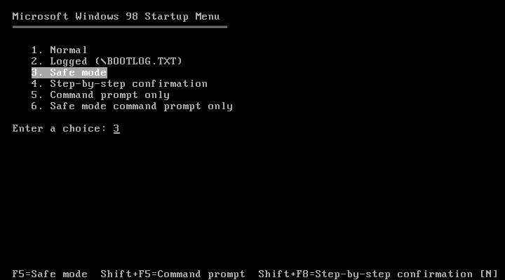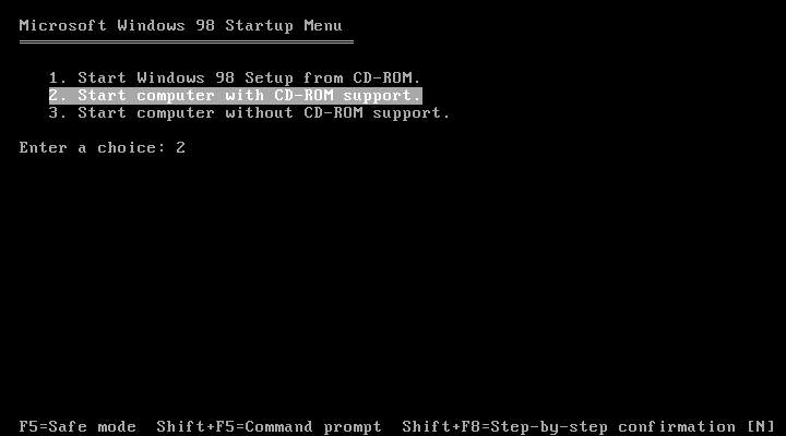 해당 화면이 뜬 상태에서 'Ctrl'키를 길게 눌러 Windows 98 Startup 메뉴로 진입한다.