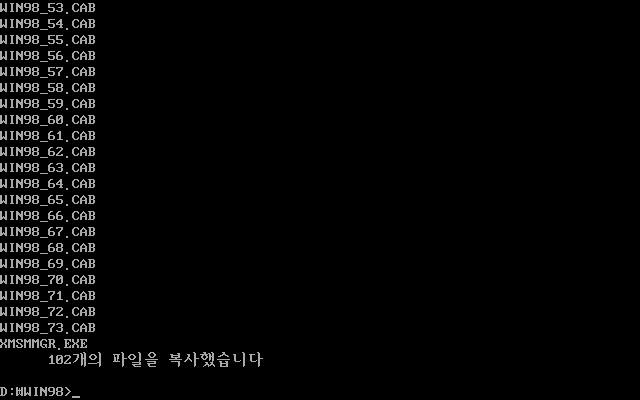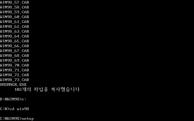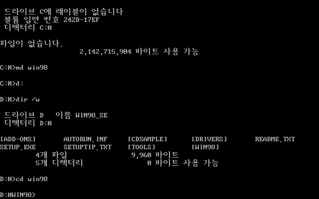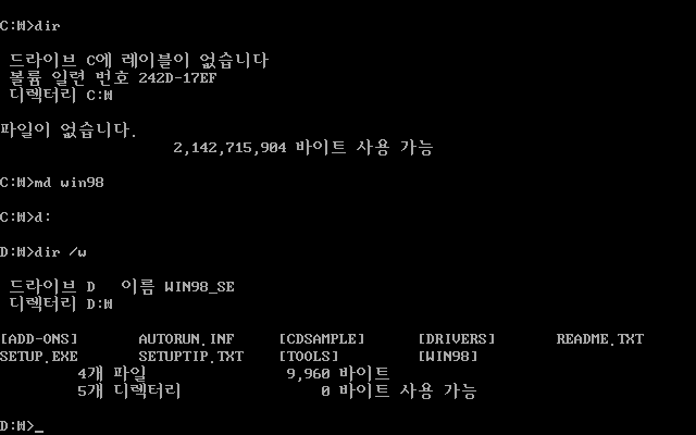 'CD WIN98'을 입력하여 D 드라이브 아래의 WIN98 설치 파일 폴더로 들어간다.