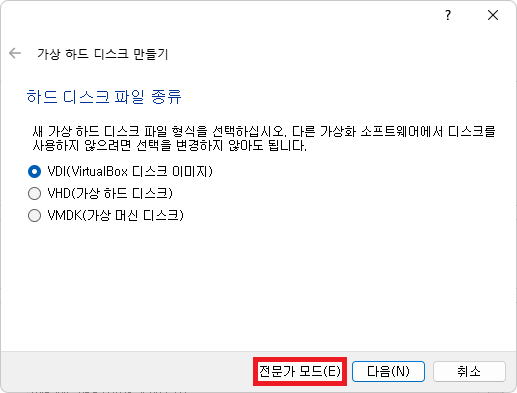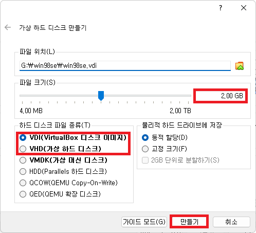 좌하단의 '하드 디스크 파일 종류'는 가상 디스크 파일의 형식을 결정하는 항목으로,