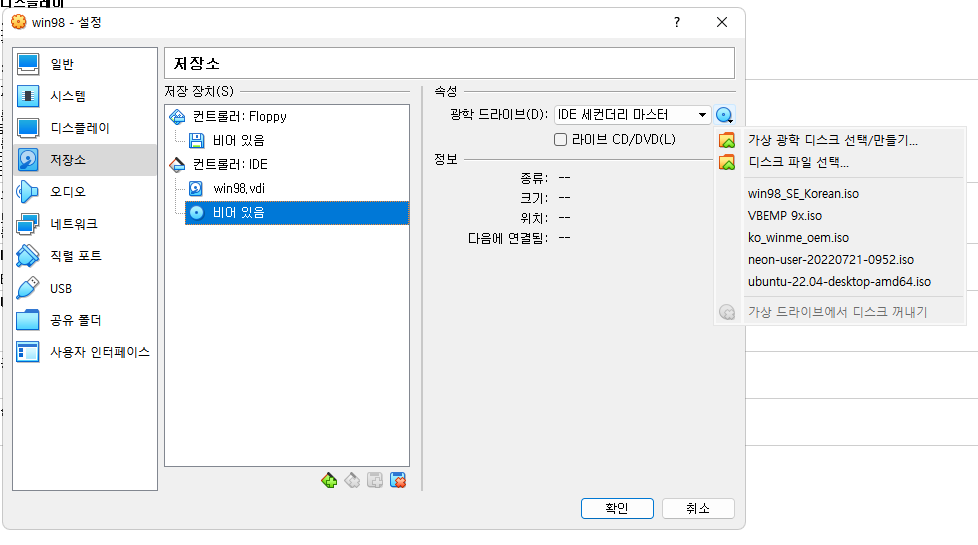 '저장소' 항목으로 이동하여 디스크 파일을 선택해주자. 까먹고 넘어가기 쉽다.