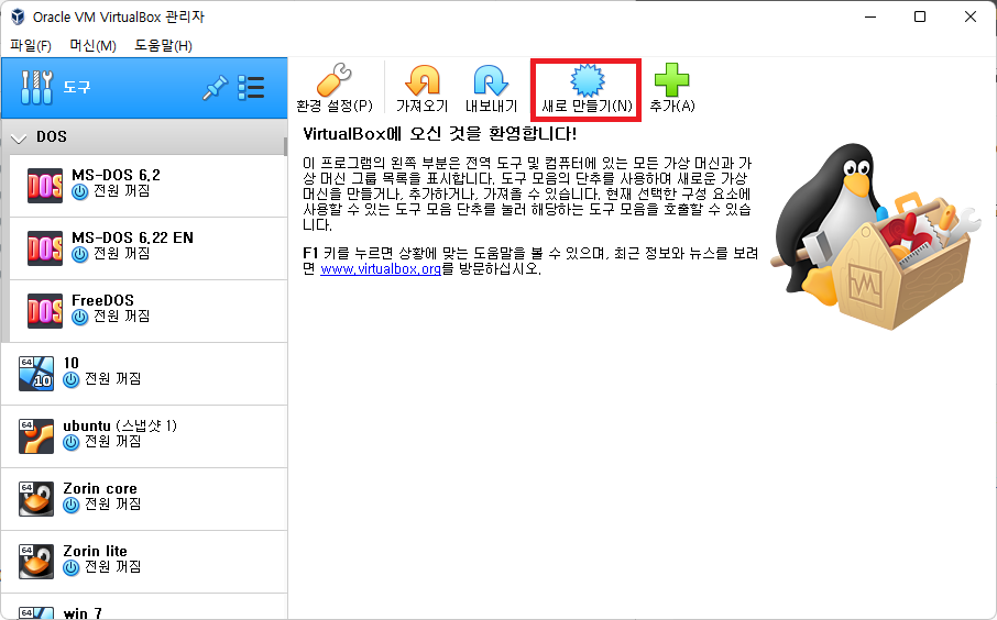 먼저 VirtualBox 가상 머신 프로필을 생성해야 한다.