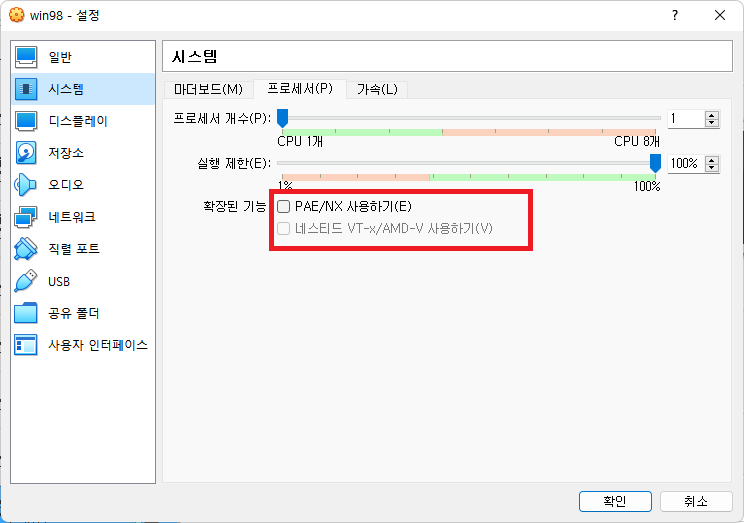 '프로세서 개수'는 1개로 한다. 9x는 멀티코어 프로세싱을 지원하지 않는다.