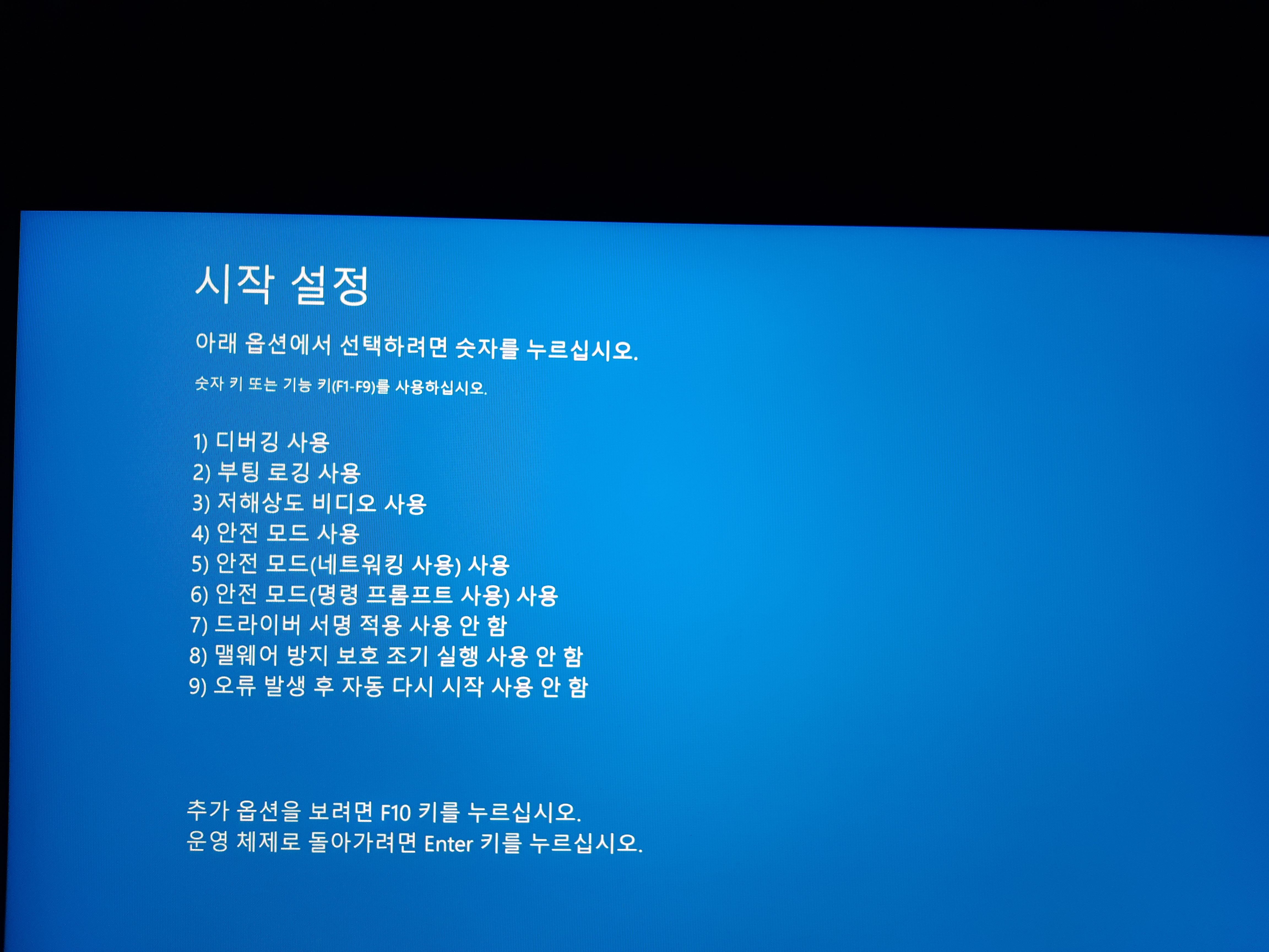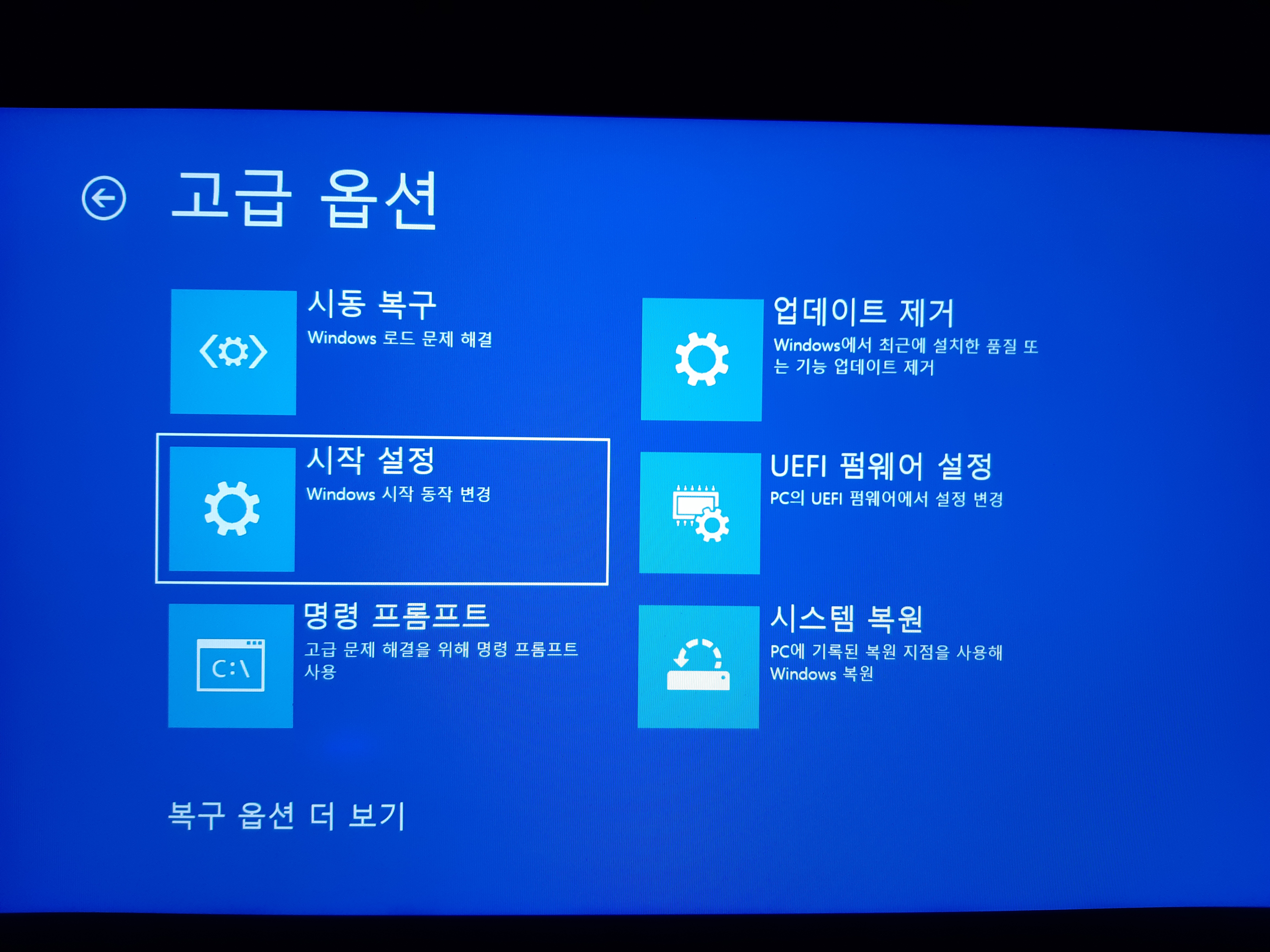 가끔 'F8 키'를 이용해 Windows RE로 진입하면 이렇게 '시작 설정' 항목이 나타나지 않을 때도 있는데,