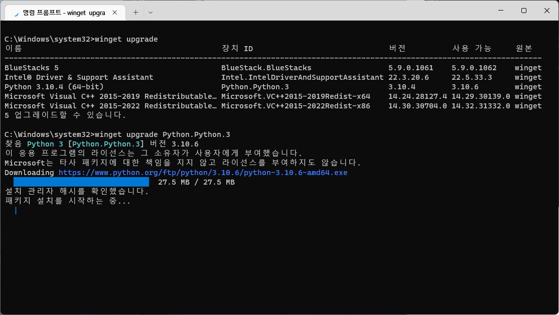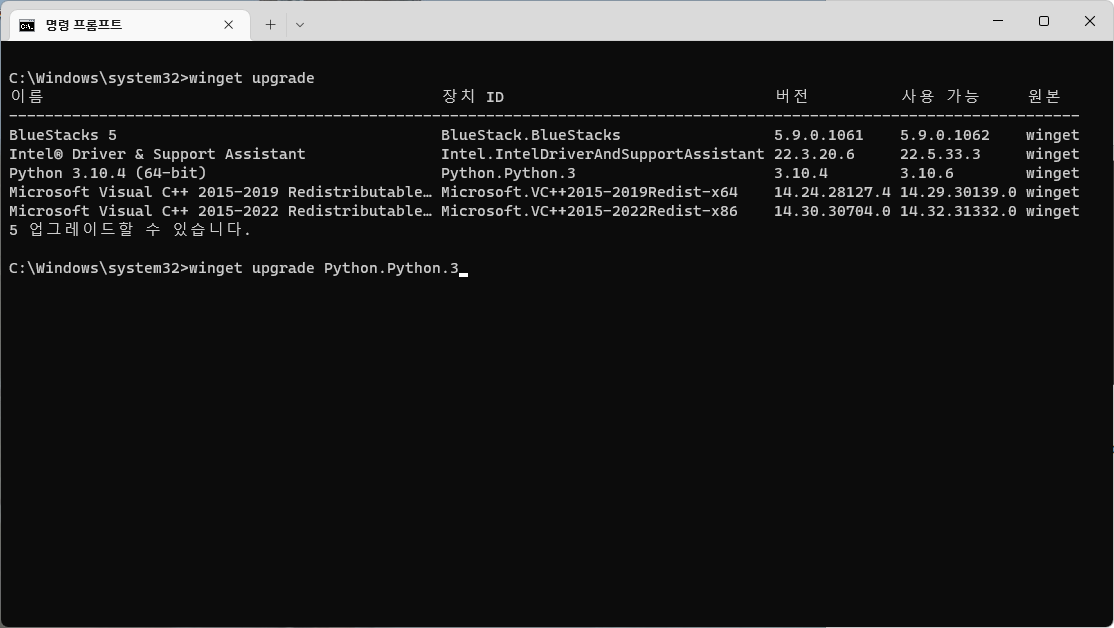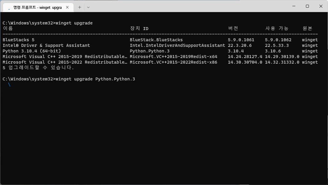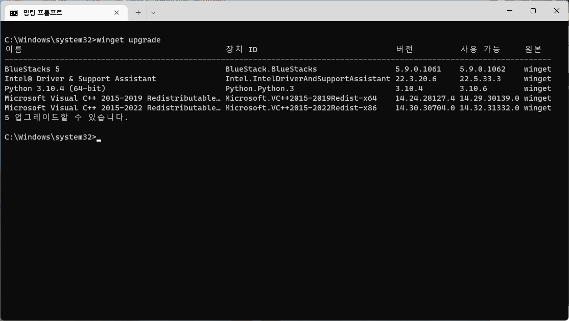 두 명령문 중 하나를 입력하면 업그레이드(업데이트) 가능한 프로그램들의 목록이 뜬다.