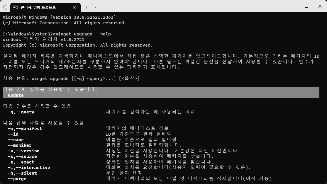 "winget update" 명령어는 "winget upgrade"의 명령 별칭으로, 원하는 것을 사용하면 된다.