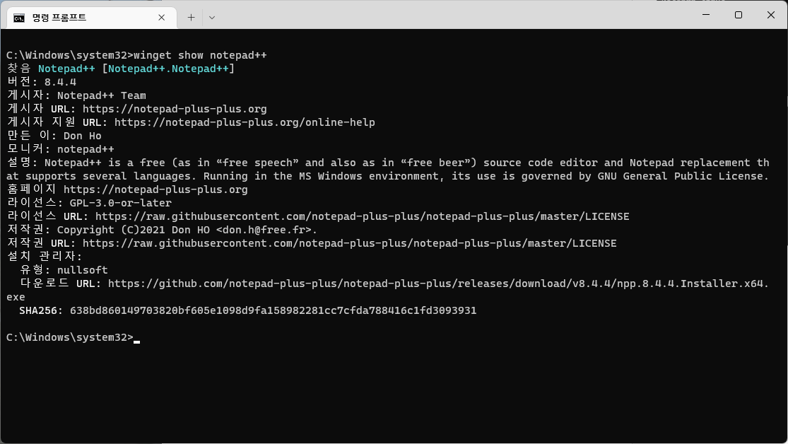 'winget show [프로그램명 / 장치 ID]'를 입력하면 해당 패키지에 대한 자세한 정보가 뜬다.