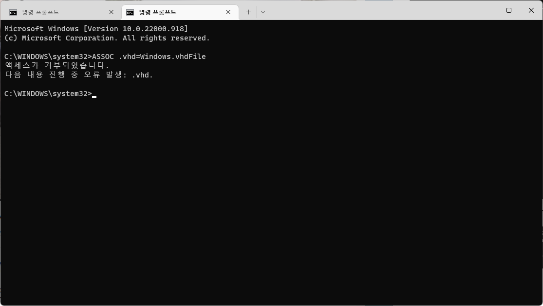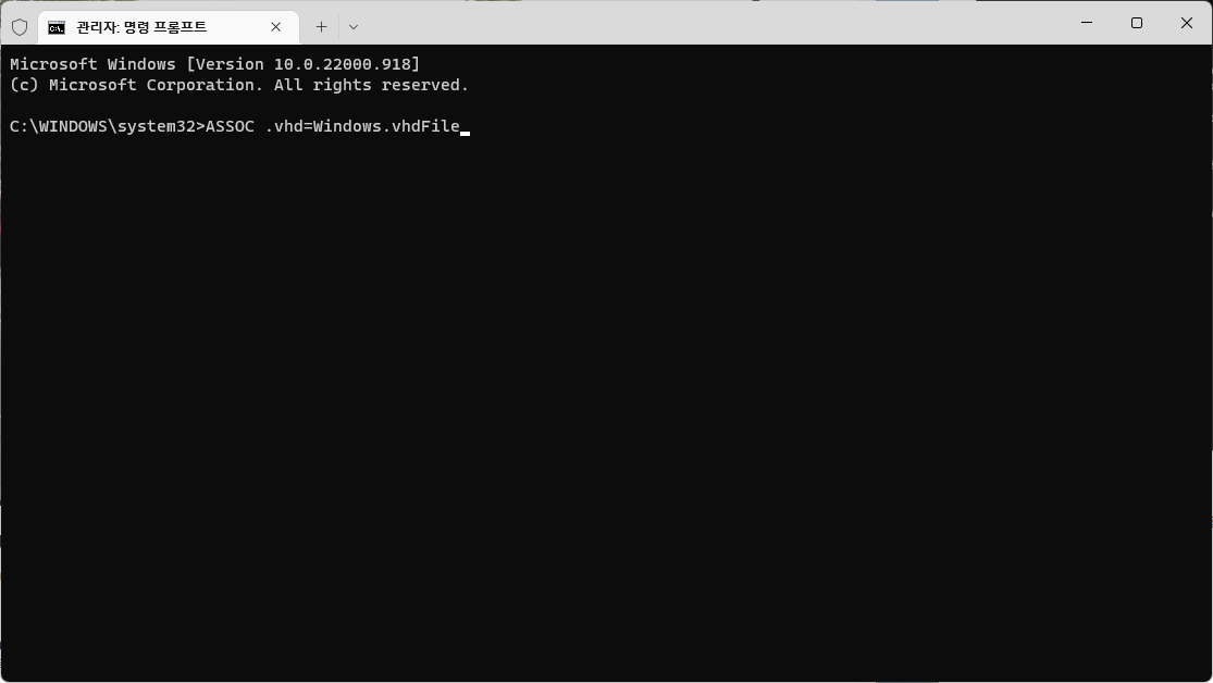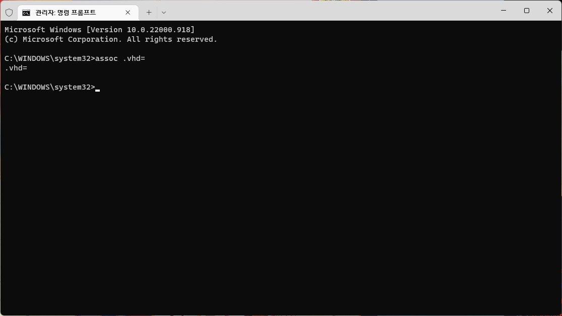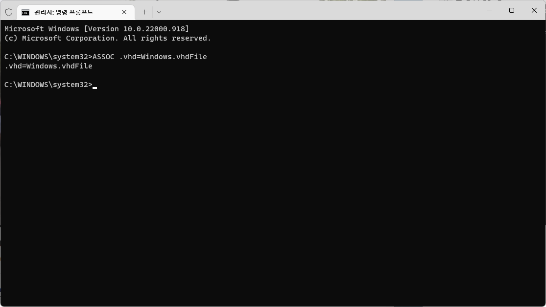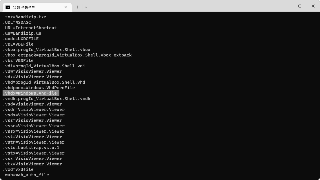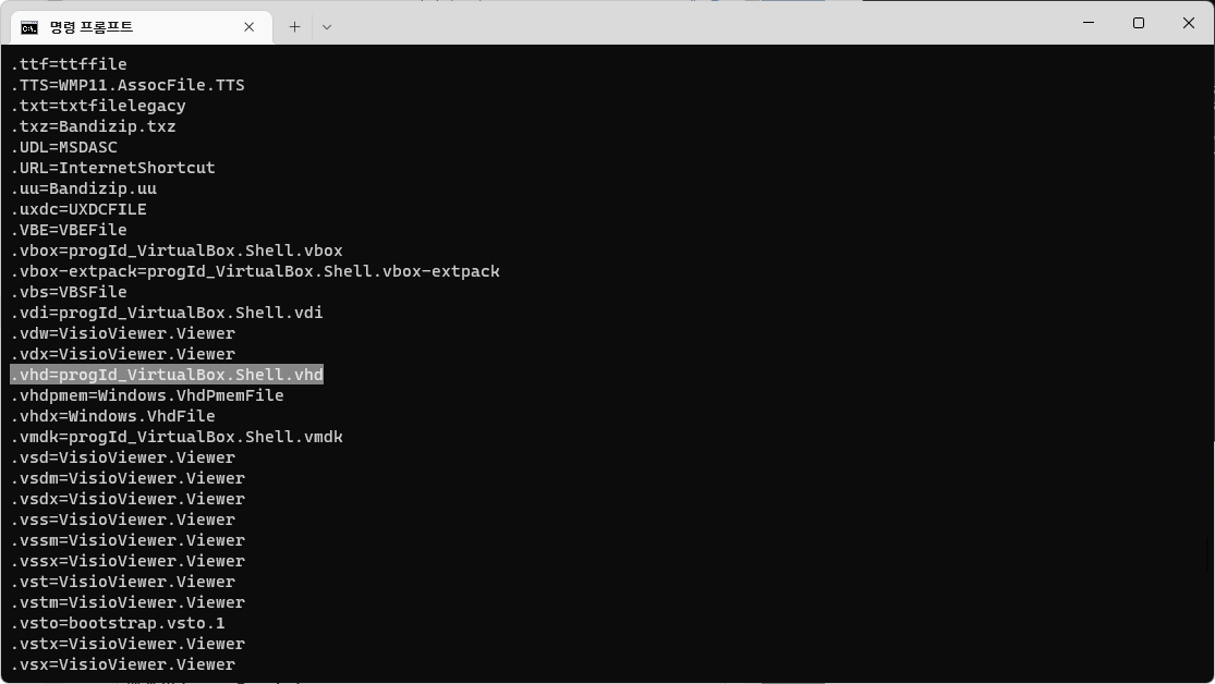 ASSOC [.확장명=[파일 유형]] 이므로 'ASSOC .vhd=Windows.vhdFile'라 입력한다.