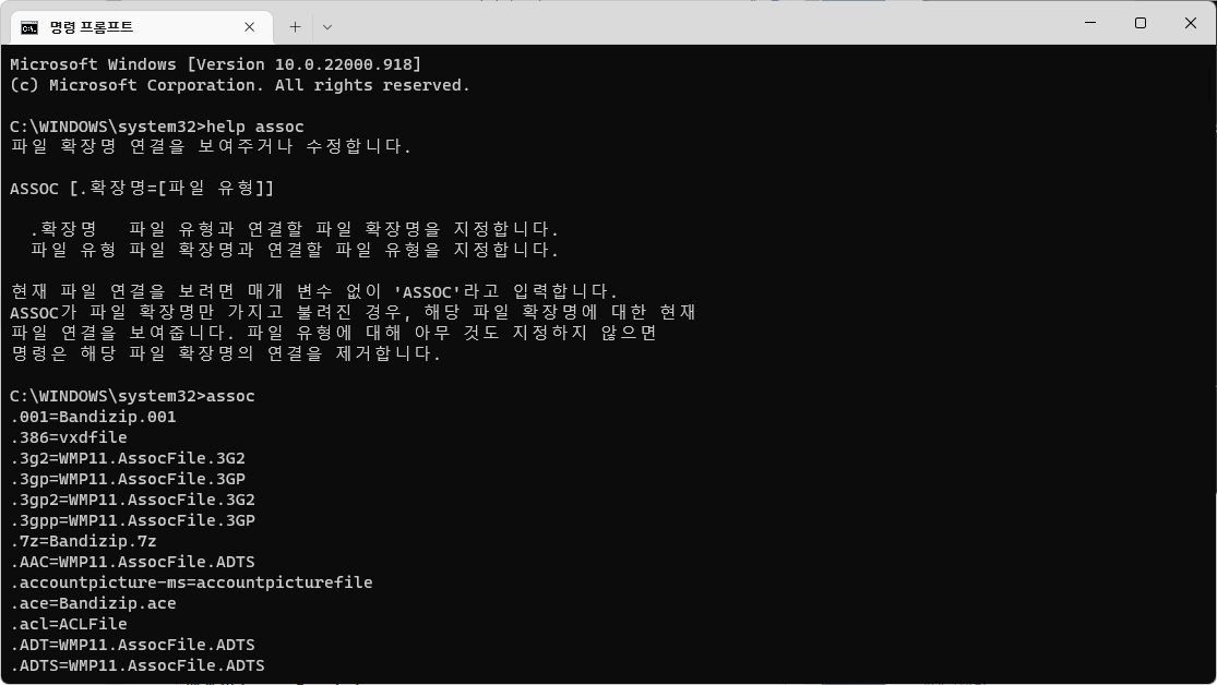 'ASSOC'라고 입력하면 다음과 같이 확장자에 연결된 프로그램의 목록이 뜬다.