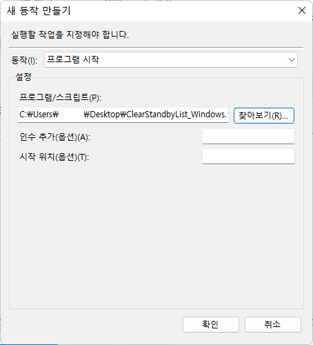 다음과 같은 창이 뜰 텐데, '동작'은 '프로그램 시작'으로, '프로그램'은 자신이 실행시키고자 하는 프로그램을 지정한다.