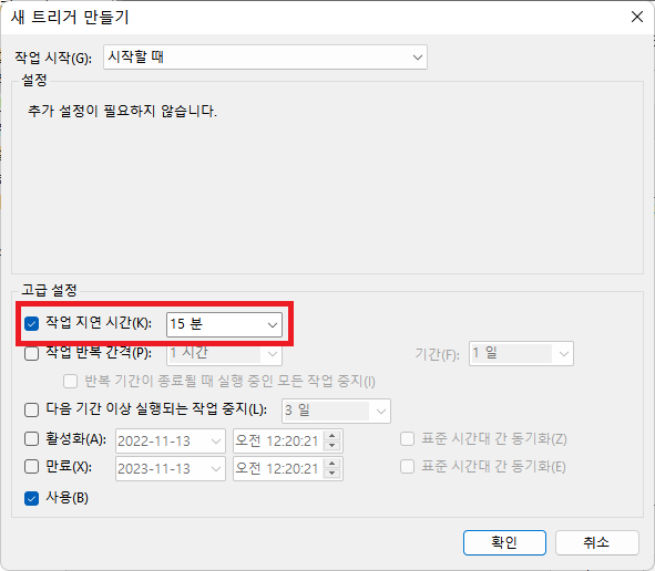'작업 지연 시간' 항목을 선택한다. 지연을 시키지 않으면 0x41303 상태와 함께 작업이 실행되지 않는 경우가 발생한다.