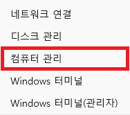 '시작 버튼'을 우클릭하거나, 'Win키+X'를 눌러 나온 메뉴에서 '컴퓨터 관리'를 클릭한다.