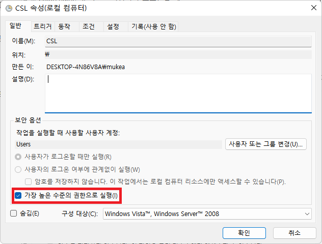 관리자 권한을 요구하는 프로그램에 경우, '가장 높은 수준의 권한으로 실행'을 지정해준다.