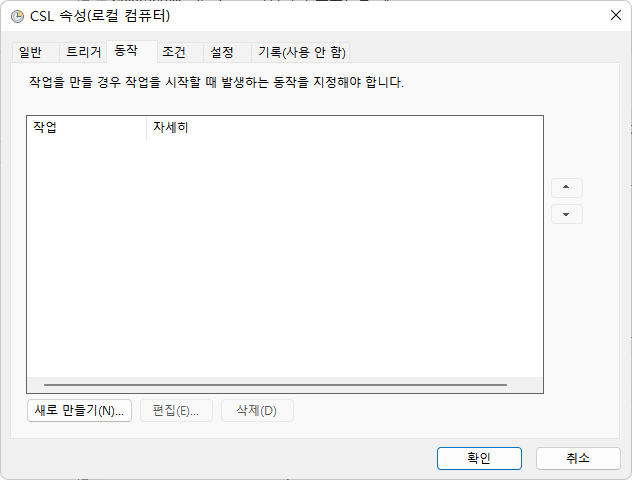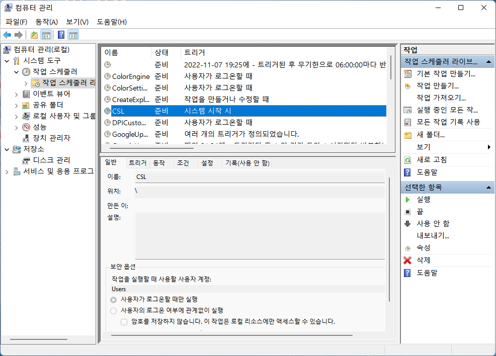 '시스템 도구' > '작업 스케줄러' > 작업 스케줄러 라이브러리'로 이동하여 '작업 만들기...'를 클릭한다.