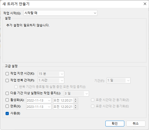 '시작할 때'를 선택한다. 이렇게 하면 Windows가 부팅을 완료한 후 해당 트리거를 실행한다.