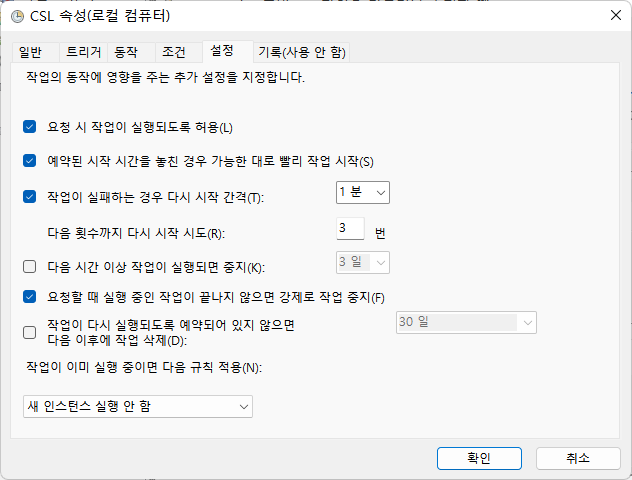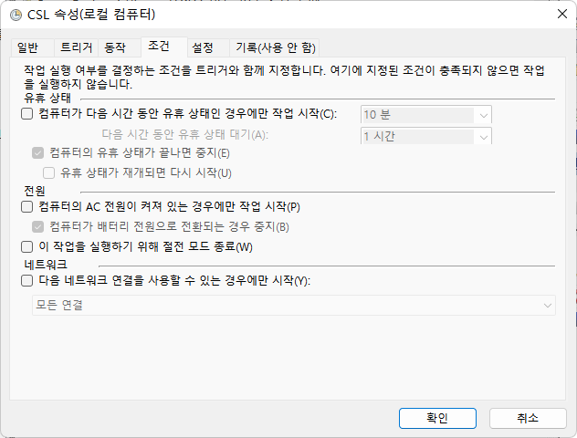 원하는 경우 '컴퓨터의 AC 전원이 켜져 있는 경우에만 작업 시작'을 선택 해제해준다.
