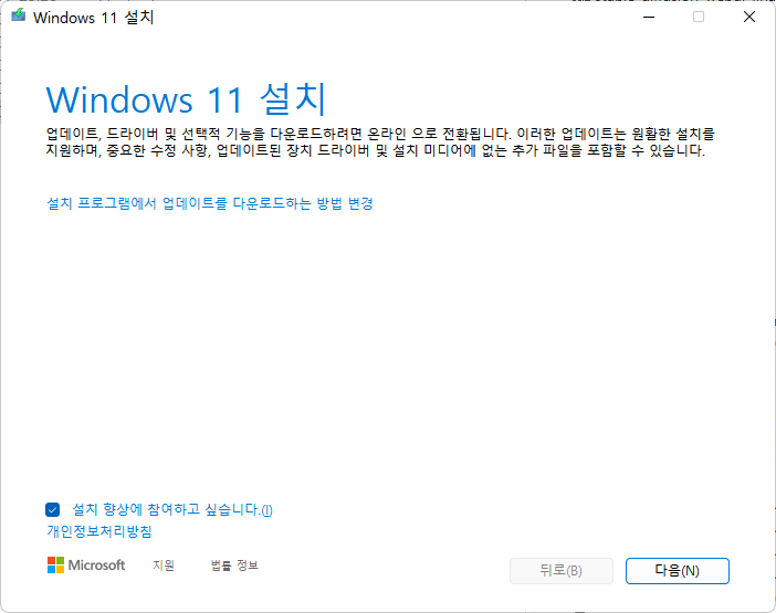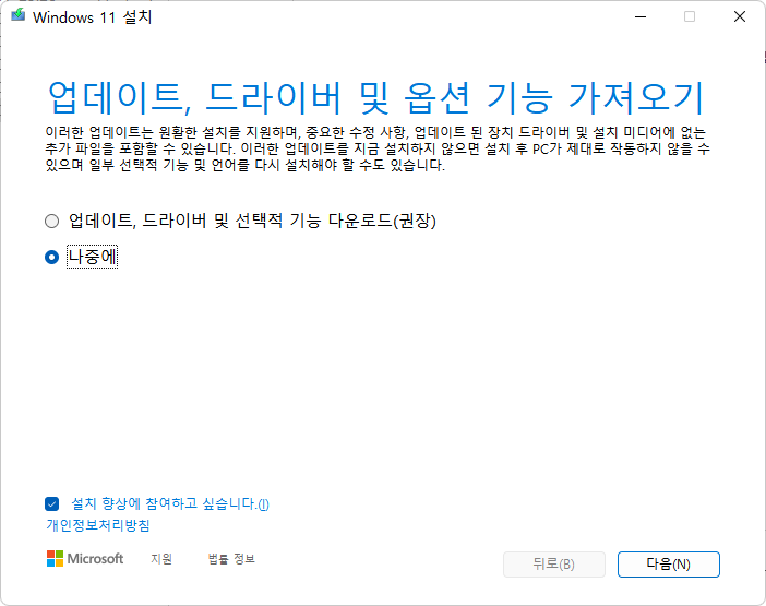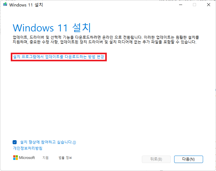 '설치 프로그램에서 업데이트를 다운로드하는 방법 변경' 항목은 설치 과정에서 최신 업데이트나 드라이버 등을 다운로드할 것인지를 묻는 항목이다.