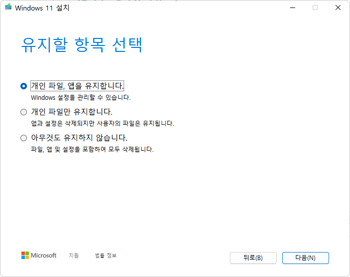 '유지할 항목 변경' 항목에서 다음과 같은 사항을 선택할 수 있다.