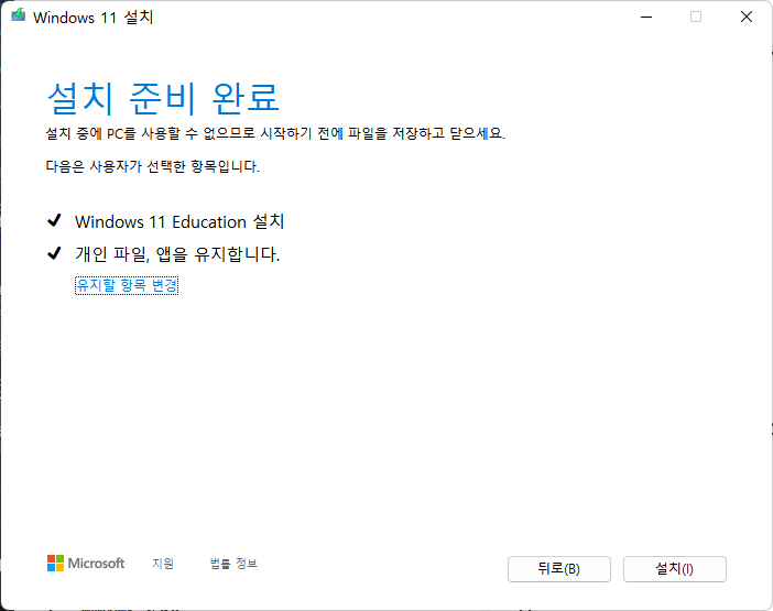 원하는 항목을 선택한 후 '다음'을 누르면 필요한 작업을 확인 후 다시 최종 화면이 뜬다.