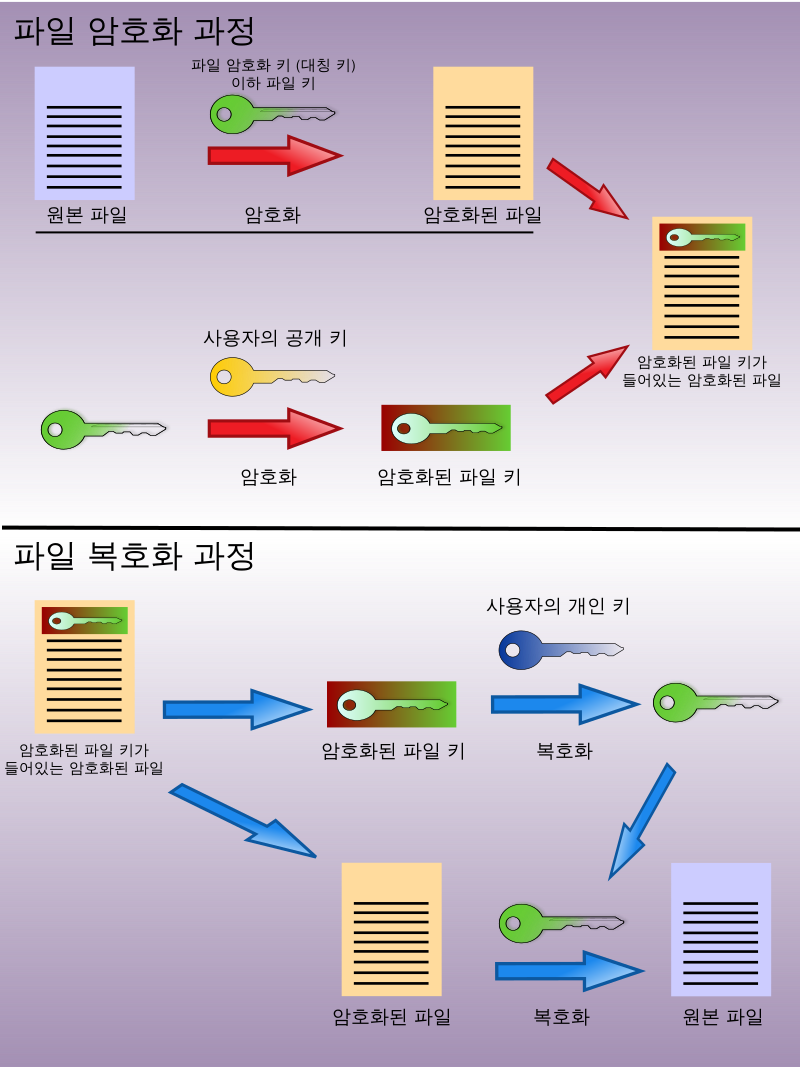 파일을 FEK를 이용하여 암호화한 후, 사용자의 공개 키를 이용하여 FEK를 암호화하고, 이 암호화한 FEK를 암호화 된 파일과 함께 저장한다.