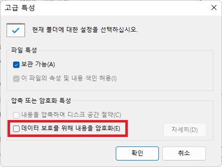 '데이터 보호를 위해 내용을 암호화'를 선택하고 확인을 누른다.