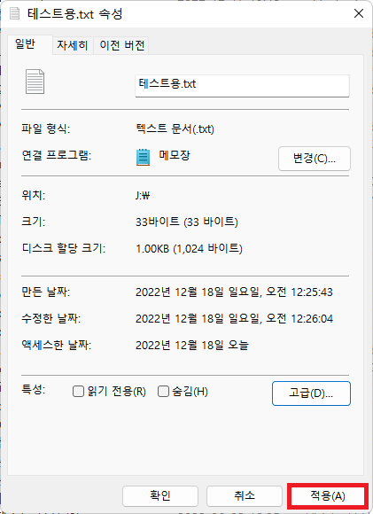 원하는 파일 또는 폴더의 속성 창을 열고, '고급(D)'를 누른다.