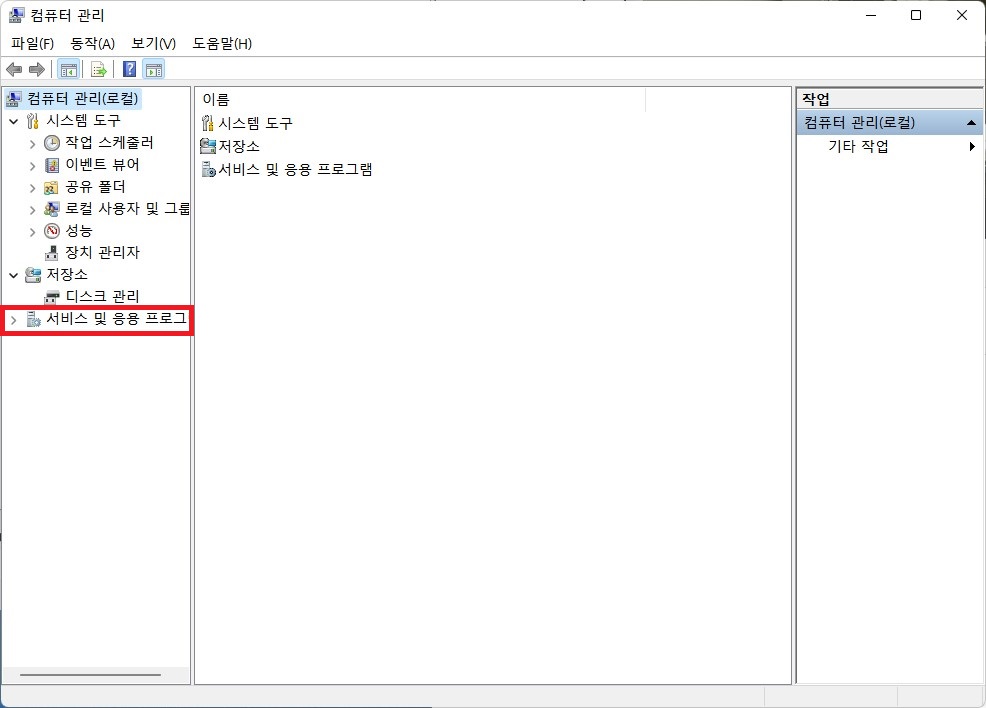 '시작 메뉴 우클릭 > 컴퓨터 관리 > 서비스 및 응용 프로그램 > 서비스'