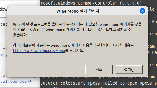 Winecfg는 와인의 설정창을 띄우는 명령어이다. 처음 Wine을 실행하면 Wine Mono를 설치하여야 한다.