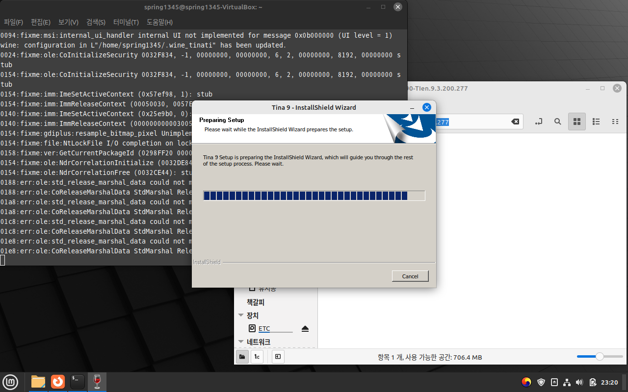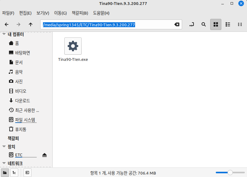 여기서는 'WINEPREFIX=~/ .wine_tinati wine /media/spring1345/ETC/Tina90-TIen.9.3.200.277/tina90-tien.exe'를 입력할 것이다.