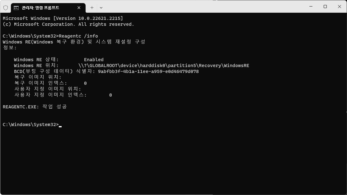 해당 정보에 따르면 필자의 컴퓨터 "harddisk0(0번 디스크)", "partition5(5번 파티션)"에 Windows RE가 설치되어 있다.