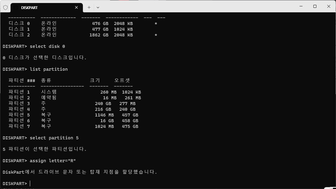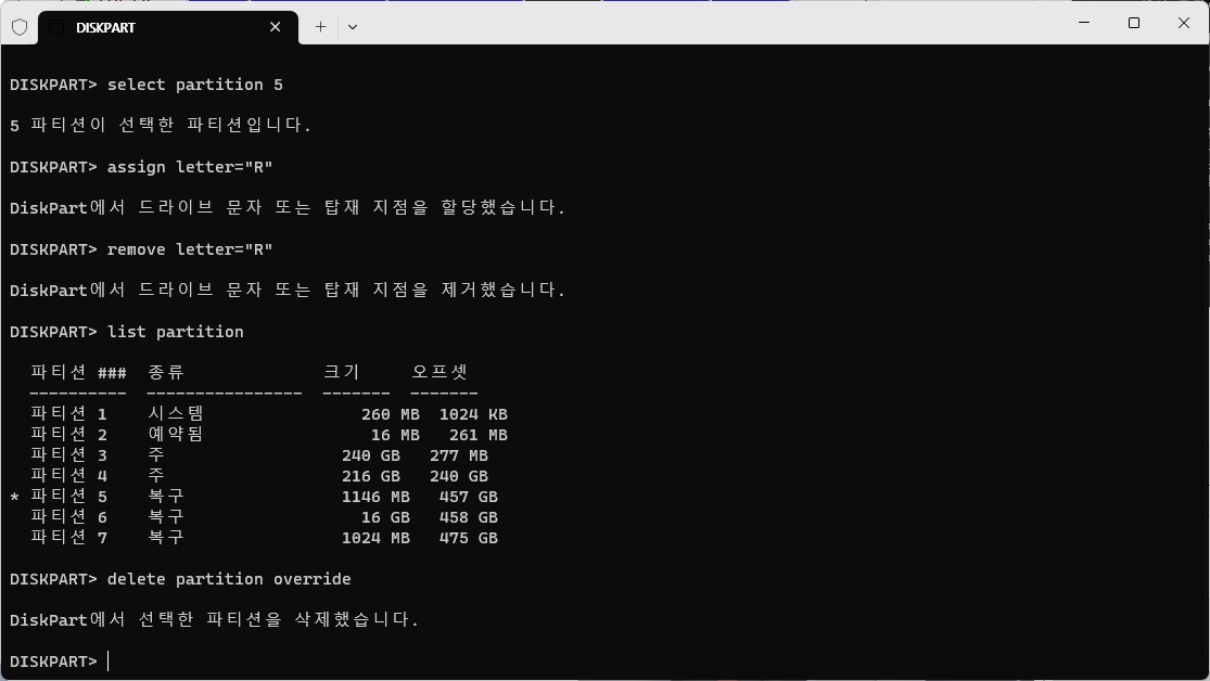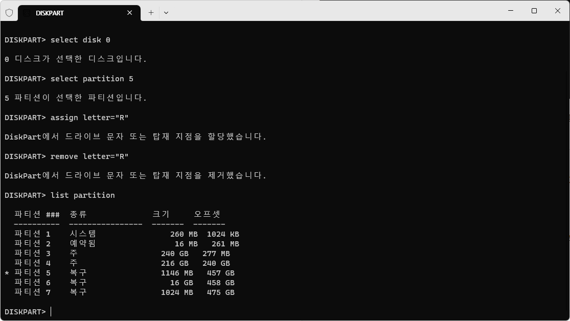 DISKPART으로 돌아와서, 먼저 복구 파티션에 할당하였던 문자를 제거한다. 그러지 않으면 이후 문자를 할당하는데 오류가 발생할 수 있다.