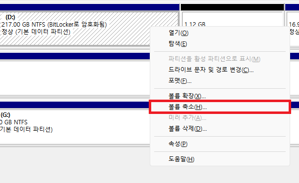 '파티션 우클릭 > 볼륨 축소'에서 원하는 만큼 용량을 축소할 수 있다.