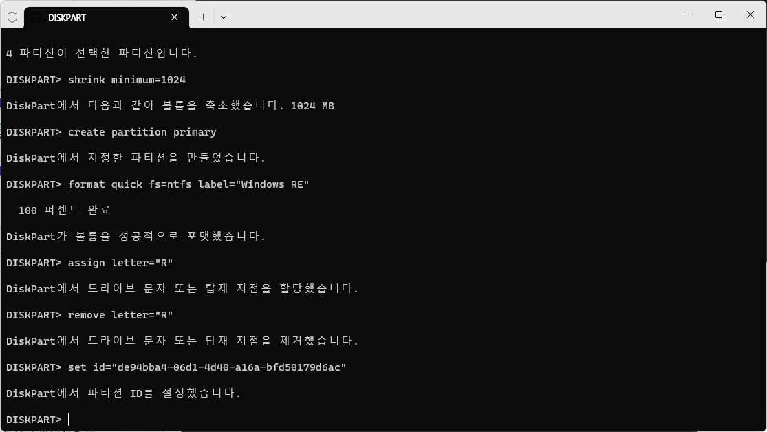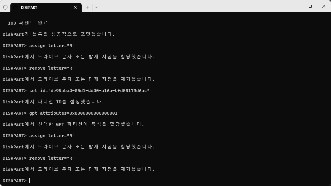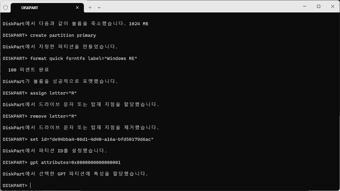 DISKPART로 돌아와서 복구 파티션을 선택한 뒤(아직은 일반 파티션일 것이다.) 다음 명령줄을 입력한다(UEFI/GPT의 경우).