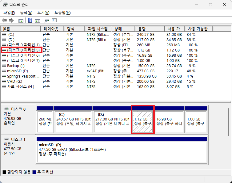 복구 파티션을 삭제했으면 복구 파티션 앞의 파티션을 축소해야 한다. 그래야 복구 파티션 크기 확장을 위한 용량을 확보할 수 있다.