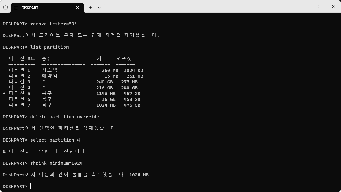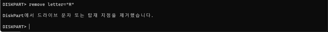 DISKPART으로 돌아와서, 복구 파티션에 할당하였던 문자를 제거한다. 그러지 않으면 이후 문자를 할당하는데 오류가 발생할 수 있다.