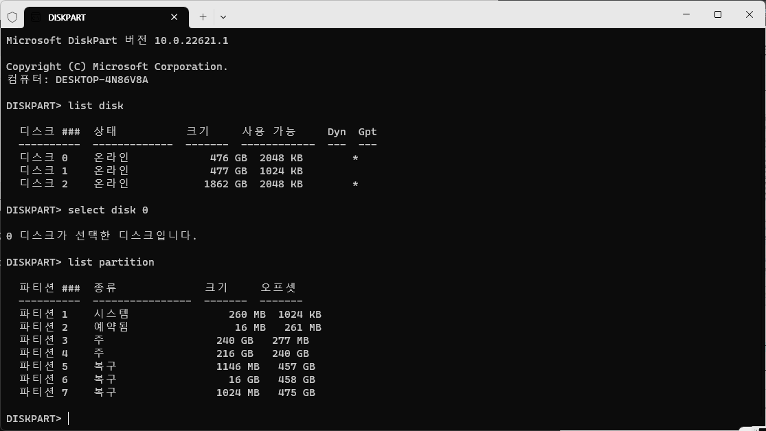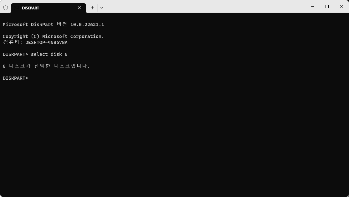DISKPART에 아래 예문을 참고하여 명령줄을 입력한다.