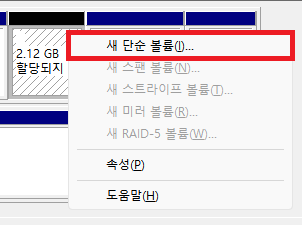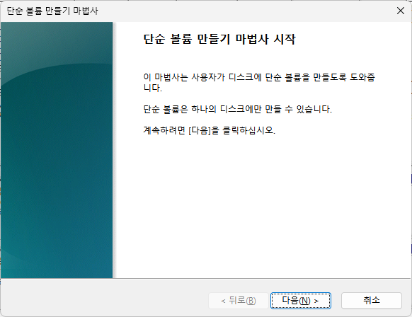 빈 볼륨을 우클릭해 컨텍스트 메뉴를 띄우고 [새 단순 볼륨]을 누르면 볼륨 생성 창이 뜬다.