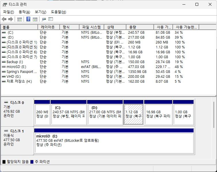 디스크 관리를 통해 본 결과 역시 동일한 것을 확인할 수 있다.