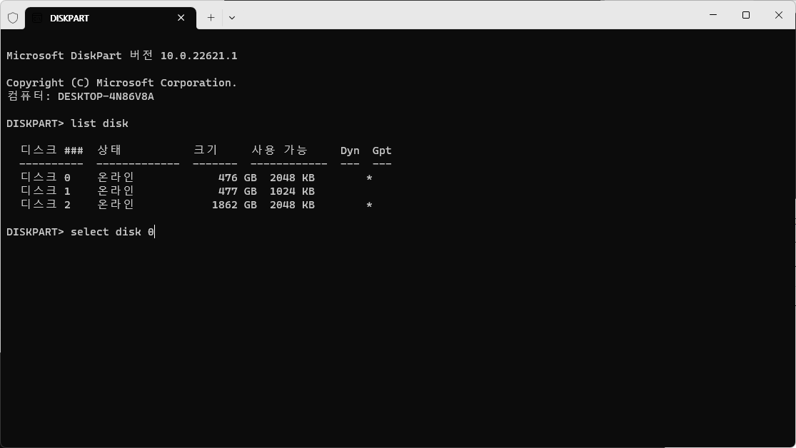 목록의 디스크 중 복구 파티션이 설치된 디스크의 번호를 찾아 아래의 예문을 참고하여 명령줄을 입력한다.