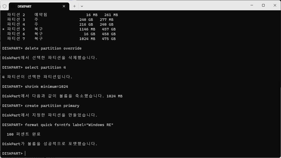DISKPART에 제거한 부팅 파티션 바로 앞의 파티션을 선택한다. 필자의 경우, 복구 파티션은 5번 파티션이었으므로 선택해야 하는 파티션은 4번 파티션이다.