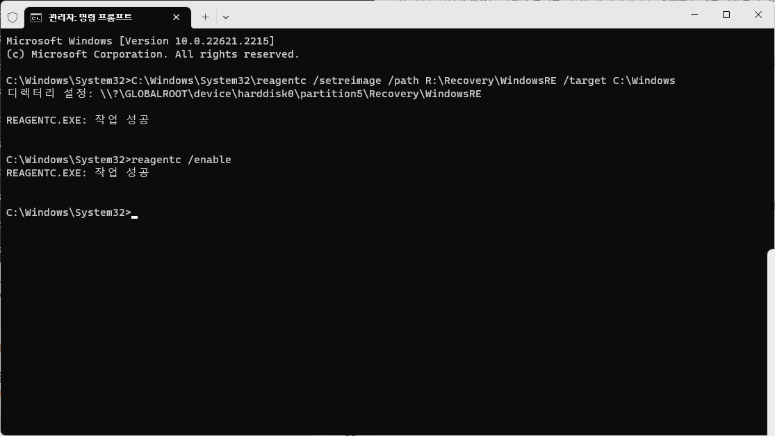 C:\Windows\System32\reagentc /setreimage /path "<복구 파티션의 드라이브 문자>:\Recovery\WindowsRE" /target C:\Windows